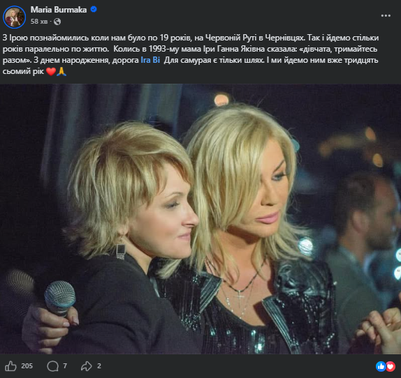 Не менш зворушливим був пост давньої подруги та колеги по сцені Марії Бурмаки. Артистка поділилася спільним архівним фото та згадала, як розпочинався їхній шлях до слави ще у далекому 1989-му.
