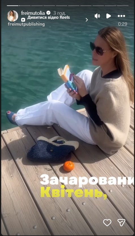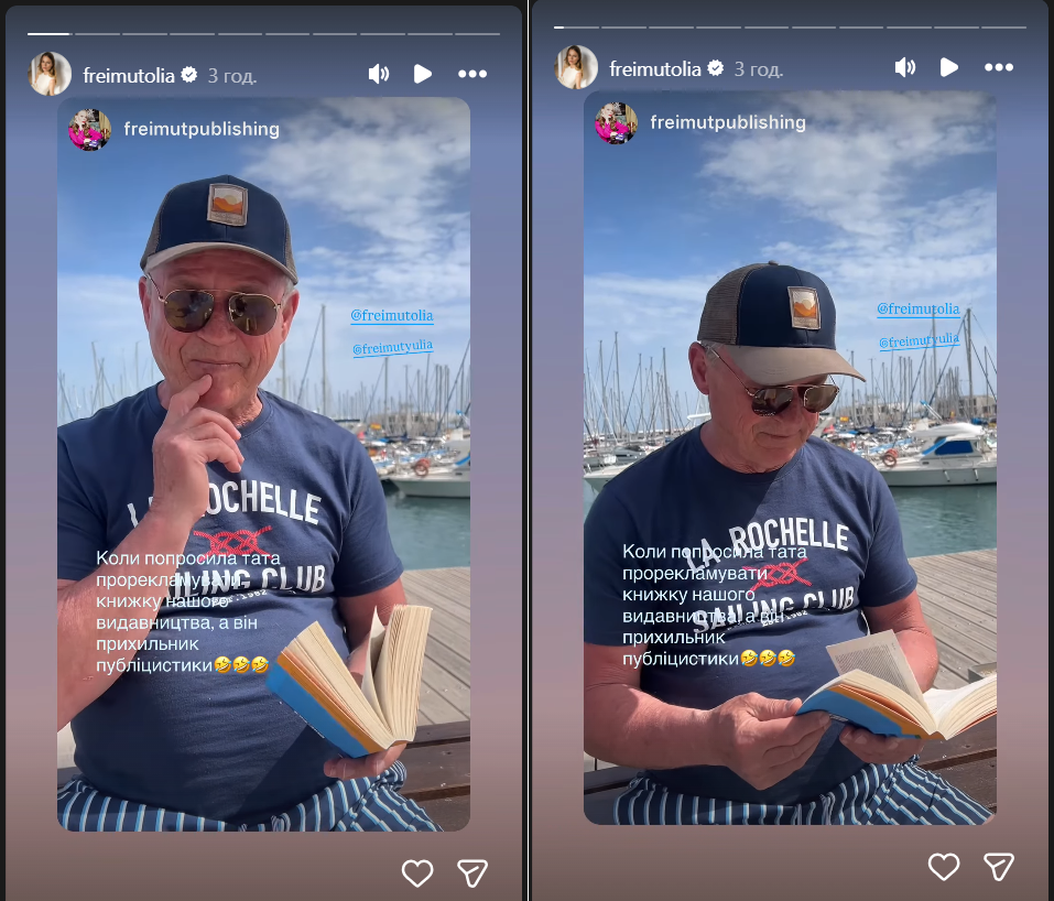 У підписі до сторіс Ольга рекламує нову книгу свого видавництва. І попросила батька допомогти їй у цьому — чоловік на кадрах позує із книгою в руках.