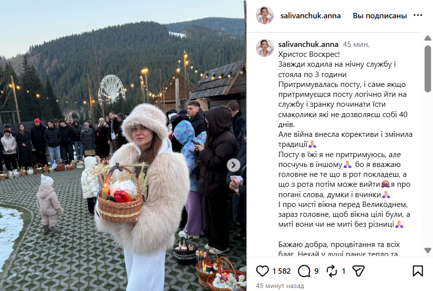 Акторка Анна Саліванчук зустріла свято у Буковелі. Вона зранку пішла до церкви, показала акуратний великодній кошик і зізналася, що раніше дотримувалася посту в їжі, а зараз — ні. Але, як уточнила, "поститься в іншому". Також акторка додала, що головне — не чисті вікна, а цілі.