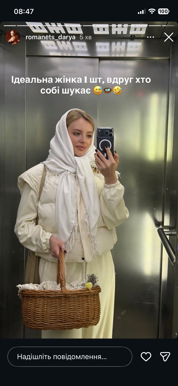 Не обійшлося і без гумору. Учасниця "Холостяка-14" Дар'я Романець виклала сторіс із кошиком і підписала в своєму стилі: "ідеальна жінка 1 шт, вдруг хто собі шукає". Великдень Великоднем, але контент — за розкладом.