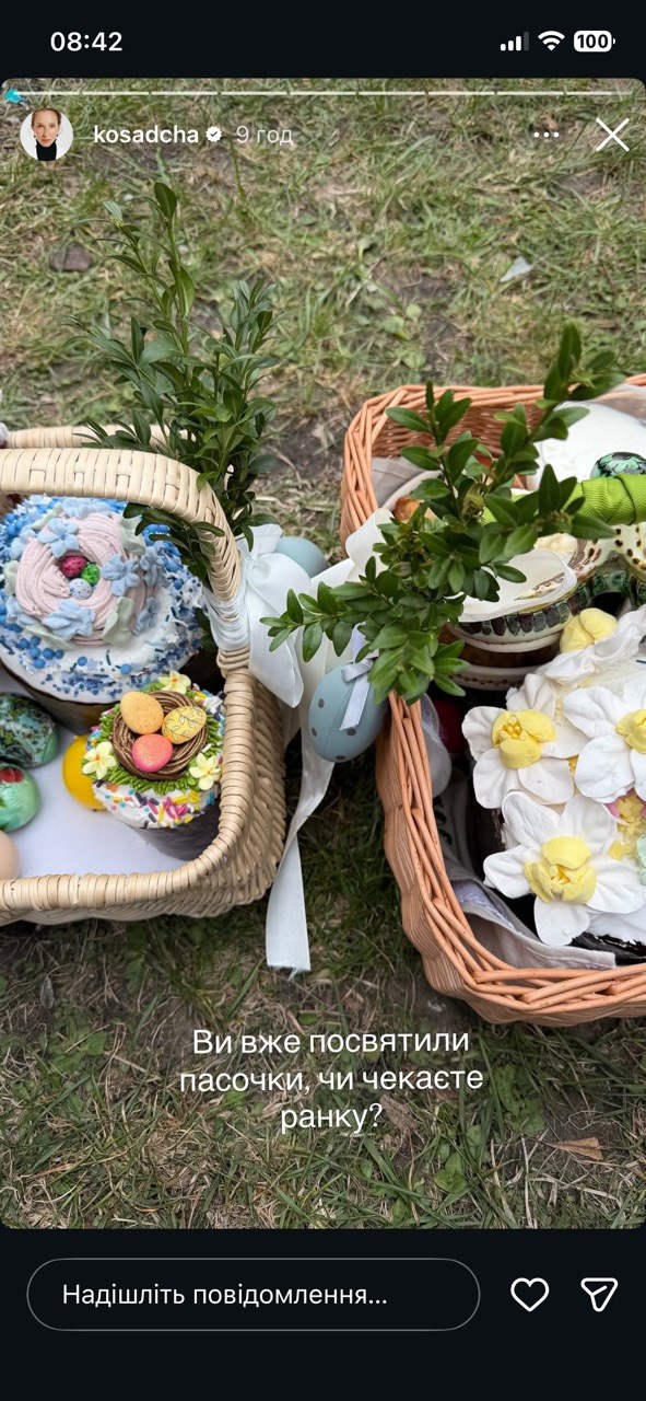 Телеведуча Катерина Осадча, схоже, обрала вечірню традицію — освячувала паску ще у суботу. У сторіс вона також засвітила святковий кошик, без зайвого глянцю — все максимально по-домашньому.