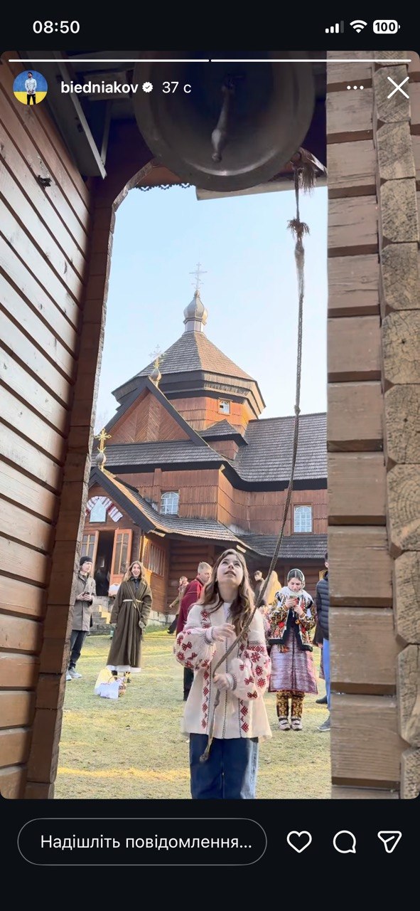 А от Андрій Бєдняков зробив ставку на сімейну атмосферу. Він освячував паску разом зі старшою донькою. Вони були вдягнені у вишиванках. На фото видно, як дівчинка самостійно б’є у дзвони в церкві.