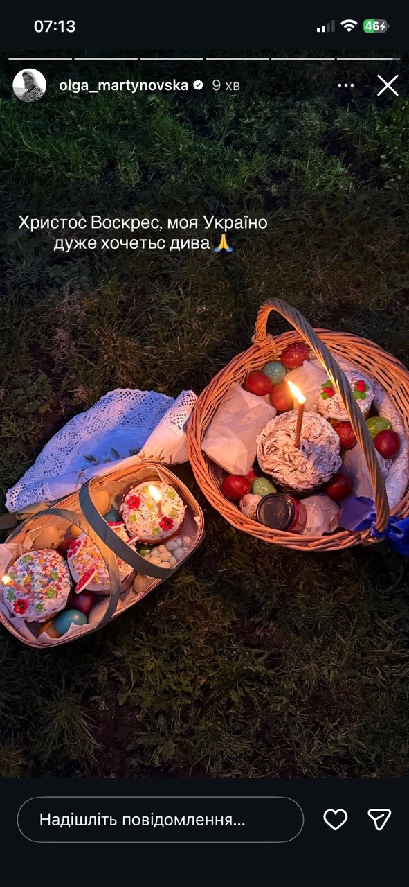 Суддя "МастерШеф" Ольга Мартиновська також не залишила підписників без святкового настрою. У сторіс вона показала свій кошик і написала короткі, але теплі слова: "Христос Воскрес, моя Україно, дуже хочеться дива".