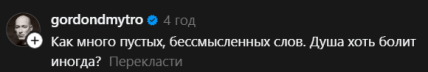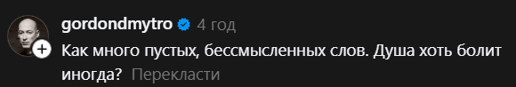 Реакція українців та публічних діячів не забарилася. Користувачі нагадали "голубці миру", що її мовчання про війну та податки у РФ безпосередньо фінансують вбивства її ж земляків. Журналіст Дмитро Гордон коротко прокоментував пост: "Як багато порожніх, безглуздих слів. Душа хоч болить іноді?".