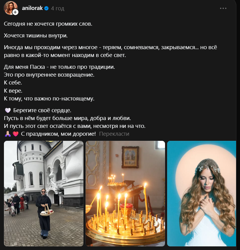 12 квітня Лорак опублікувала пост у Threads, де позує в церкві з великоднім кошиком. Російською мовою вона видала порцію роздумів про "внутрішнє повернення до себе".