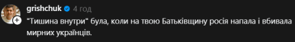 Народний депутат Роман Грищук теж не стримав емоцій: ""Тиша всередині" була, коли на твою Батьківщину Росія напала і вбивала мирних українців".