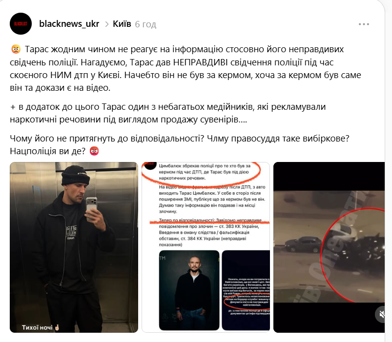 Однак у соцмережі Threads користувачі обговорюють іншу версію. В акаунті "blacknews_ukr" опублікували пост, в якому стверджується, що саме Цимбалюк був за кермом автомобіля і дав неправдиві свідчення поліції на місці ДТП.