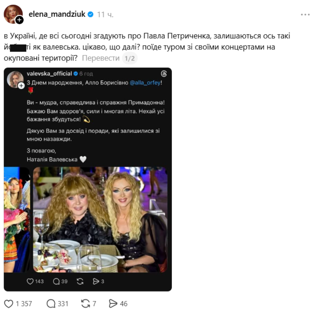 Пост Валевської з’явився у Threads — співачка у привітанні похвалила Пугачову і відмітила її у дописі. На публікацію швидко звернула увагу Олена Мандзюк. Вона оприлюднила скрін привітання та різко висловилася щодо вчинку Валевської: