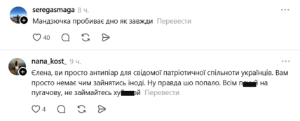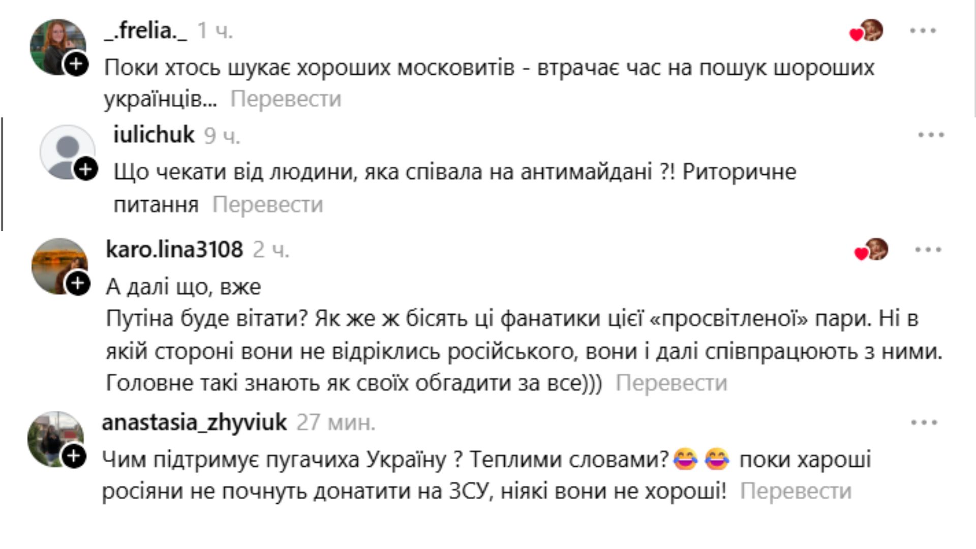 Реакція аудиторії була миттєвою — і, як це часто буває, полярною. Частина користувачів підтримала Мандзюк, наголошуючи, що під час війни навіть символічні жести у бік російських зірок виглядають недоречно: