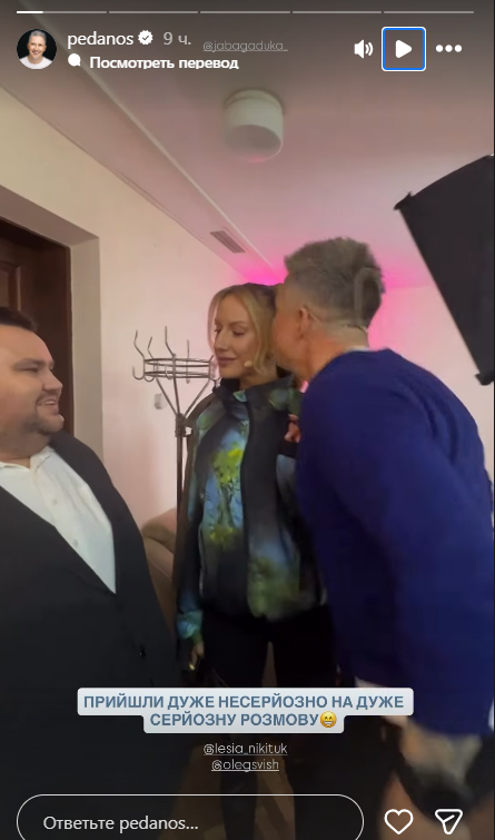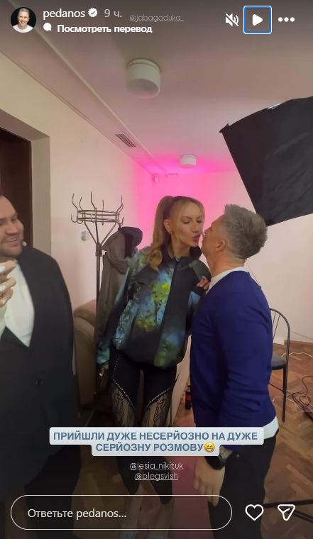 Далі зйомка пішла не за сценарієм. Телеведучий кілька разів намагався дістати до щоки Леся Нікітюк, але через різницю у зрості це не виходило навіть із підстрибуванням. Таку сторіс Педан виклав на своїй сторінці в Інстаграм.