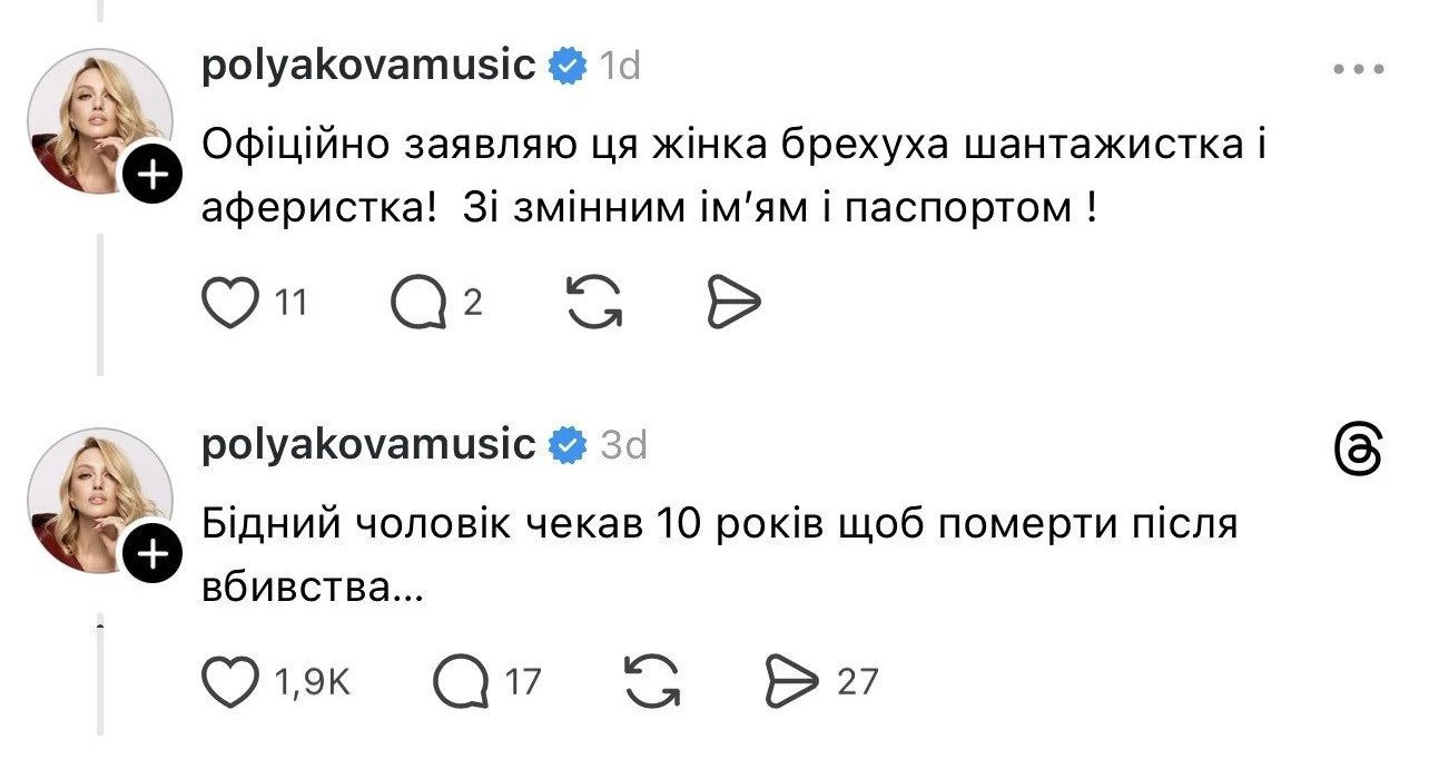 Оля Полякова назвала свого експродюсера "брехухою, шантажисткою та аферисткою". "Бідний чоловік чекав 10 років, щоб померти після вбивства", — написала Полякова в коментарях, натякаючи на те, що її чоловік Вадим Буряковський не причетний до того, що сталося.