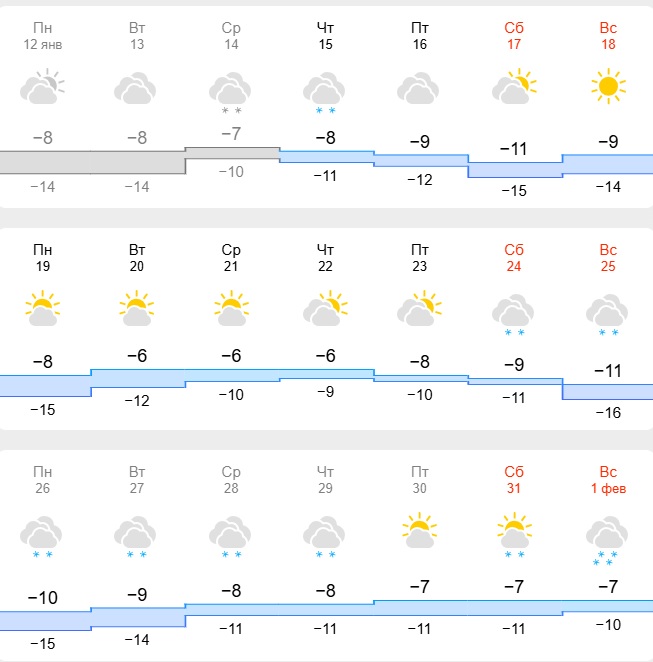 Так, наприклад, фахівці сервісу meteofor вважають, що з 17 січня до 1 лютого в Харкові буде похолодання. Вже 17 числа стовпчики термометрів можуть опуститися до -11-15 градусів. А в "найтепліші дні" цього періоду прогнозується -6-9 градусів. Таким чином, аж до початку лютого в обласному центрі температура коливатиметься в цьому діапазоні. Можливі невеликі опади у вигляді снігу.