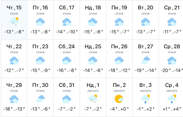 Схожої думки дотримуються синоптики з meteo.ua. Вони також вважають, що з 17 до 31 січня у Харкові може похолодати. 17 січня температура повітря буде на рівні -10-14 градусів. А в найхолодніші дні морози можуть сягати -14-20 градусів. На цьому сайті опадів не прогнозують.