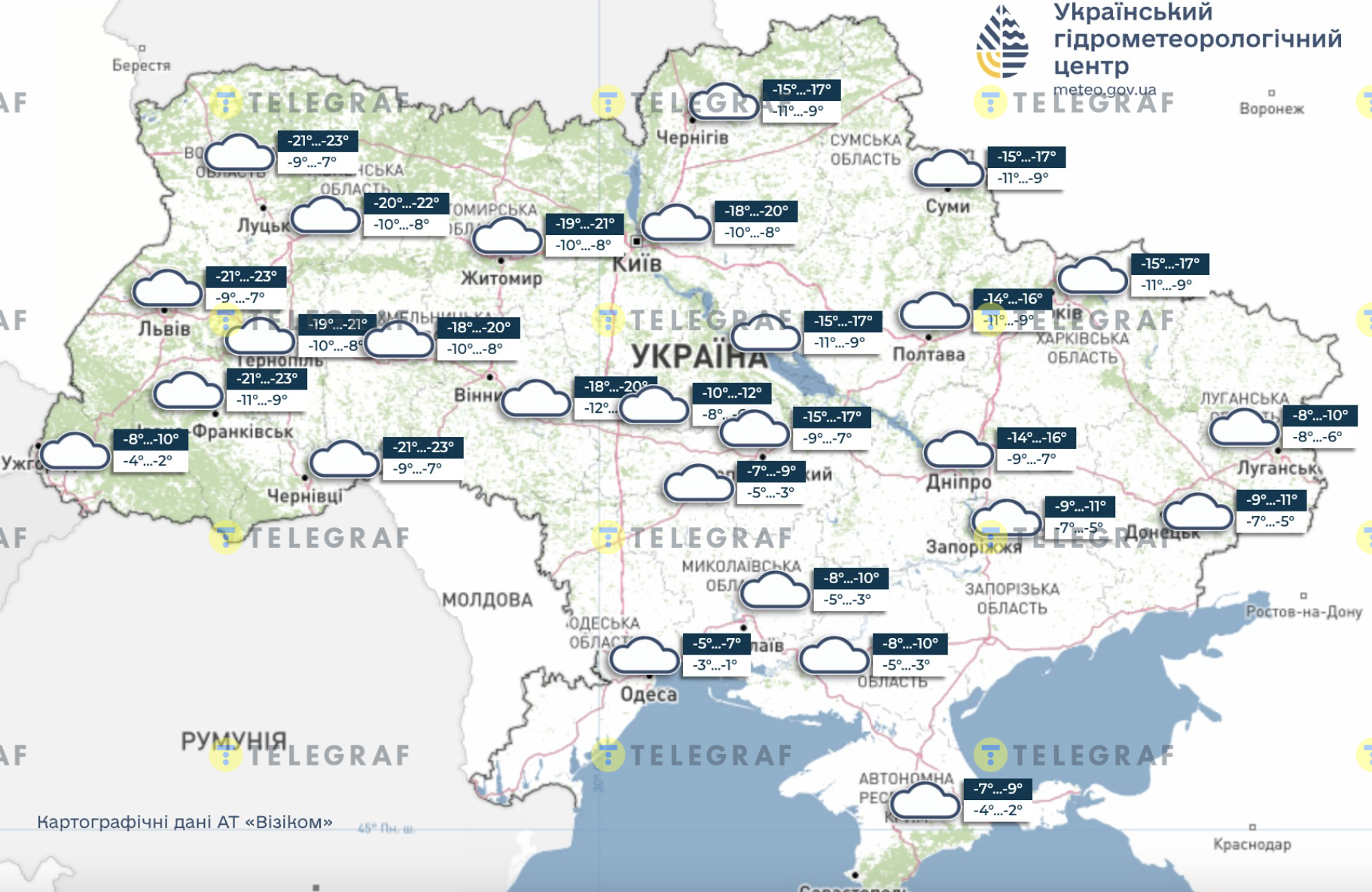 За даними Укргідрометцентру, 22 січня у всіх областях очікується сильний мороз вночі, який триматиметься навіть вдень. Однак на півдні буде дещо тепліше до -1 градуса. Опадів синоптики не прогнозують, лише сильну хмарність.