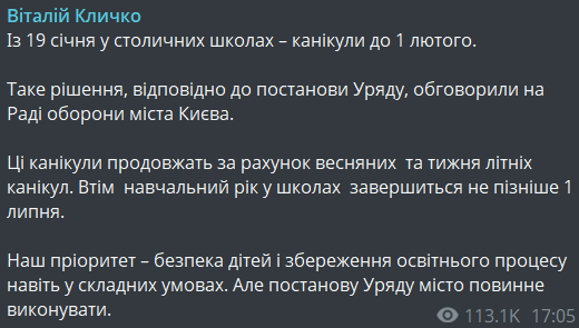 "Ці канікули продовжать за рахунок весняних та тижня літніх канікул. Втім навчальний рік у школах завершиться не пізніше 1 липня. Наш пріоритет – безпека дітей і збереження освітнього процесу навіть у складних умовах", – заявив Кличко.