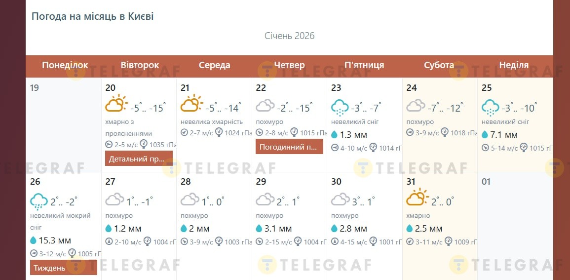 На цьому тижні, 20-25 січня, у Києві збережеться морозна зимова погода. Вдень температура повітря коливатиметься в межах -7…-2 градуси, а вночі стовпчики термометрів опускатимуться до -15…-7 градусів. У ці дні можливий невеликий сніг. На небі іноді очікується прояснення.