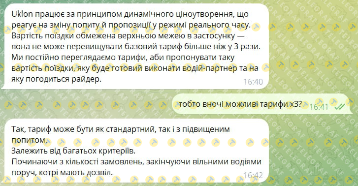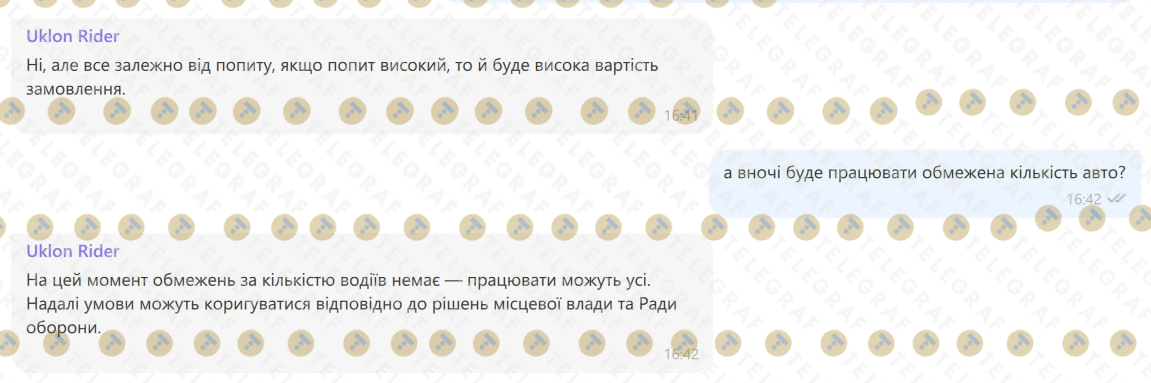 Там відповіли, що тарифи такі самі, але можуть бути втричі дорожчі за звичайні, якщо попит на поїздки високий. На цей момент обмежень за кількістю доступних водіїв немає — працювати можуть усі, хто має дозвіл. У майбутньому умови роботи водіїв можуть коригуватися залежно від рішень місцевої влади та Ради оборони.