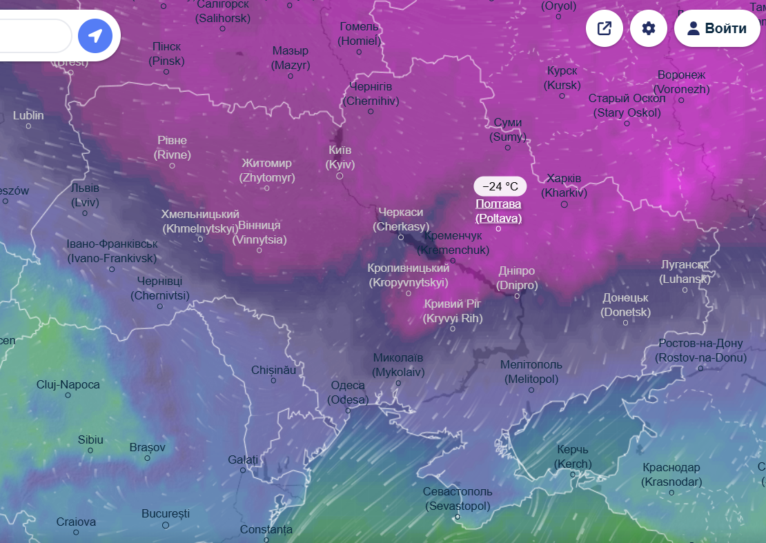 За прогнозами порталу Ventusky, ночами 1 та 2 лютого в Україні буде дуже морозно. Найхолодніше — на Полтавщині, до -23, за відчуттями ця температура буде як -30.