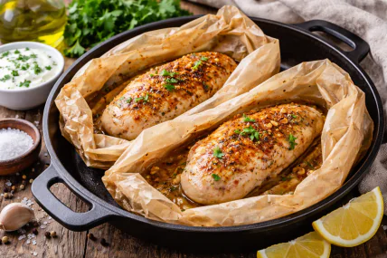 Для цього методу підходять курятина, індичка, свинина та яловичина. М’ясо достатньо приправити спеціями, загорнути в аркуш щільного пергаменту й викласти на добре розігріту суху сковорідку. Смажити потрібно на середньому вогні, періодично перевертаючи згорток. За 2–3 хвилини до готовності пергамент можна відкрити, щоб утворилася рум’яна скоринка.