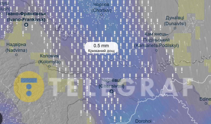 Крижаний дощ у Івано-Франківську та Чернівцях 28 січня. Скріншот: Ventusky