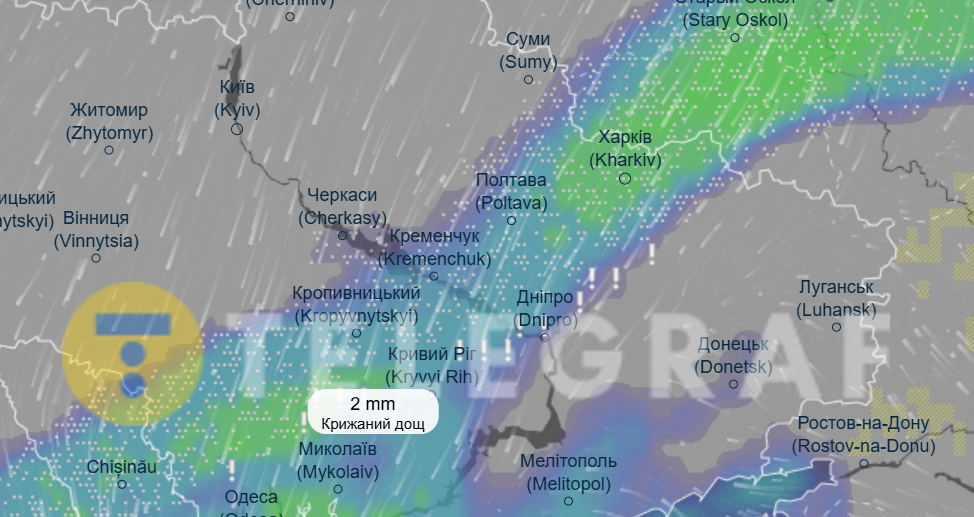 Крижаний дощ у Дніпрі 30 січня. Скріншот: Ventusky