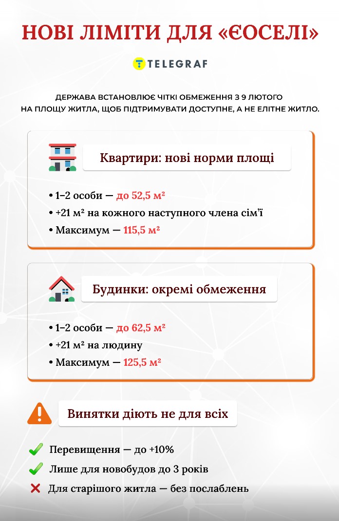 З 9 лютого програма доступної іпотеки "єОселя" встановлює чіткі обмеження щодо розміру житла, яке можна купити за державною підтримкою. Нові правила такі: