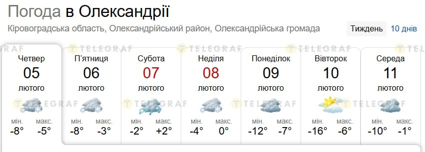 Якою буде погода в Олександрії, Кіровоградській області, до 11 лютого 2026