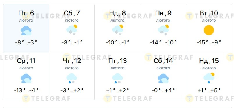 Найхолоднішими днями прогнозуються 9 та 10 лютого. У цей час нічна температура може знижуватися до 15…14 градусів морозу. Вдень також утримається сильний холод — близько 10…9 градусів нижче нуля. Попри ясну погоду, мороз відчуватиметься досить різко.