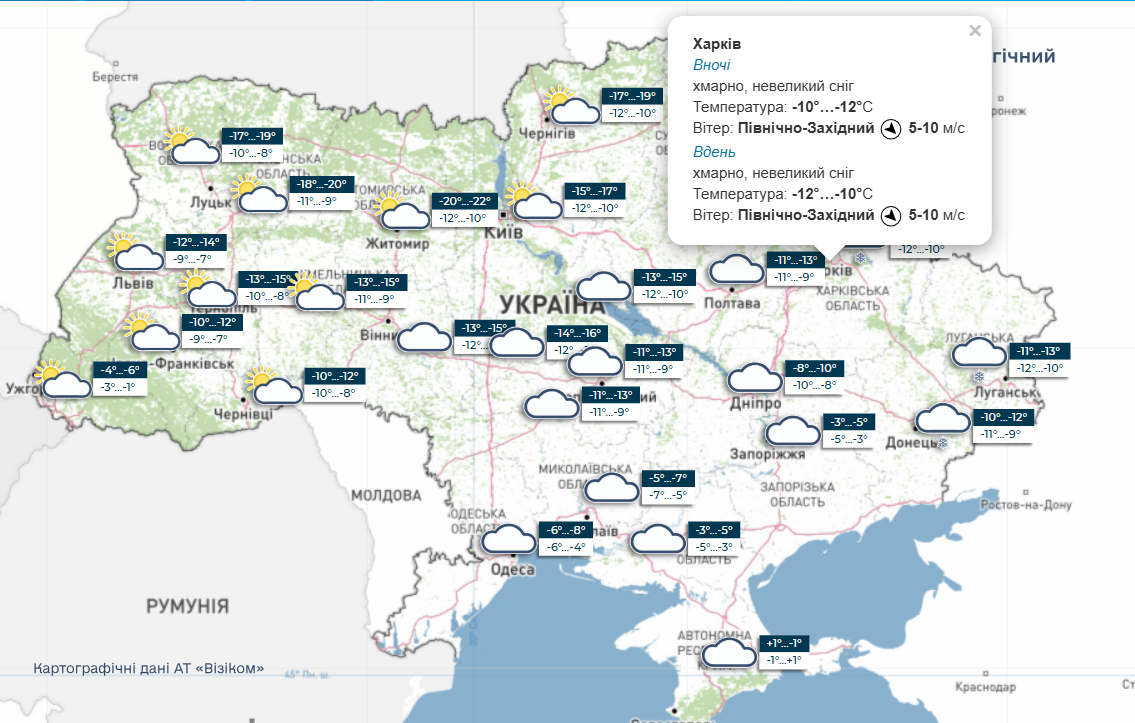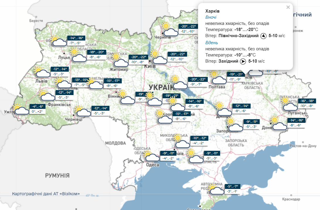 За розрахунками сайта meteofor, морози 9-10 лютого будуть трохи нижчими. Мінімально стовпчики термометрів у Харкові опустяться до 16 градусів морозу.