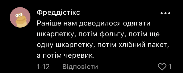 • Раніше нам доводилося одягати шкарпетку, потім фольгу, потім ще одну шкарпетку, потім хлібний пакет, а потім черевик.
