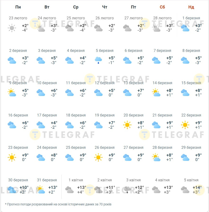 Початок місяця очікується доволі холодним. Вдень температура триматиметься приблизно на рівні +3…+5 градусів, а вночі можливі невеликі морози до -3 градусів. Погода буде переважно хмарною, місцями можливі невеликі дощі, тому весняне тепло прийде не одразу.