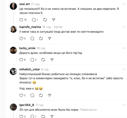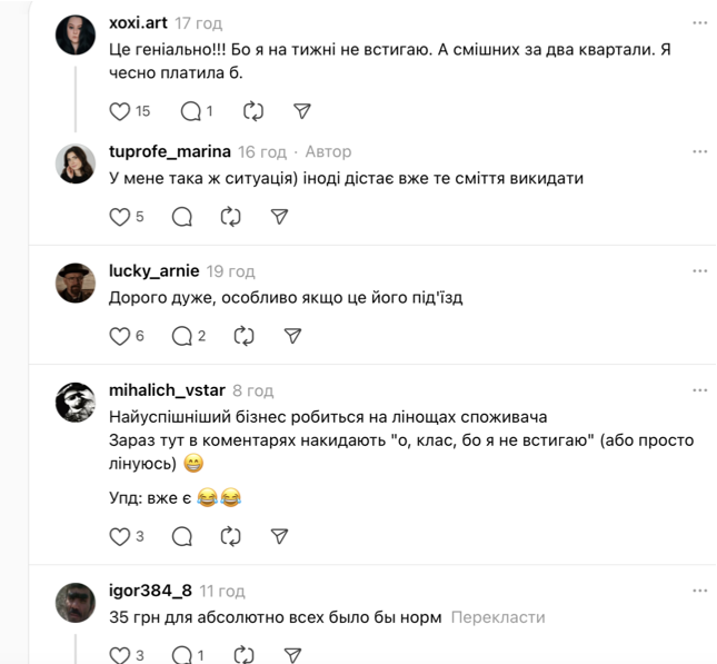 Багато хто зазначив, що через постійну зайнятість на роботі просто не встигає вчасно виносити пакети, тому з радістю делегували б це сусіду за такі гроші.