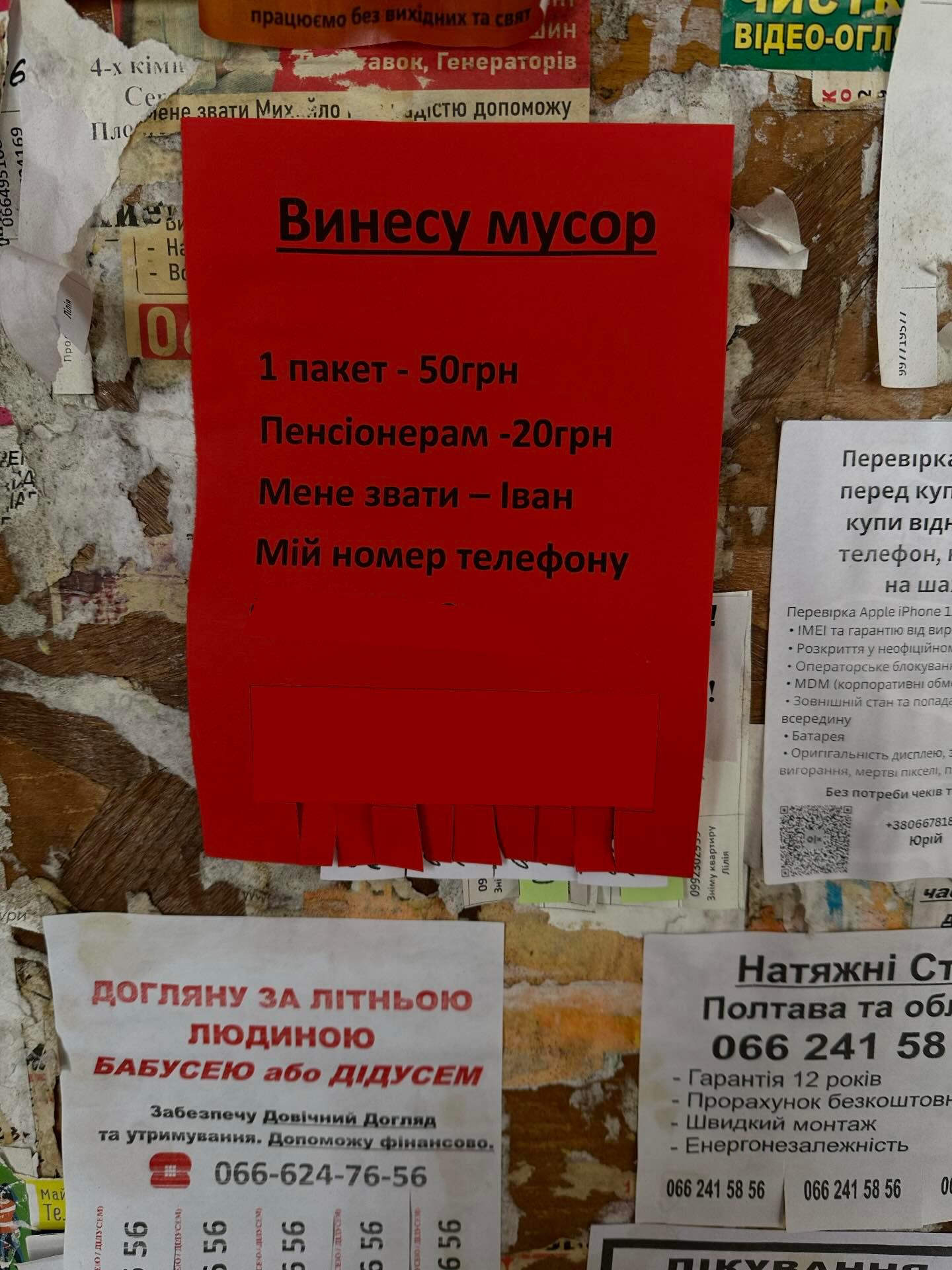Він вирішив заробляти на тому, що більшість людей намагається відкласти на потім — на винесенні сміття. Свою послугу він оцінив у 50 гривень. При цьому автор оголошення виявив неабияку чуйність: для пенсіонерів діє спеціальна ціна — всього 20 гривень.
