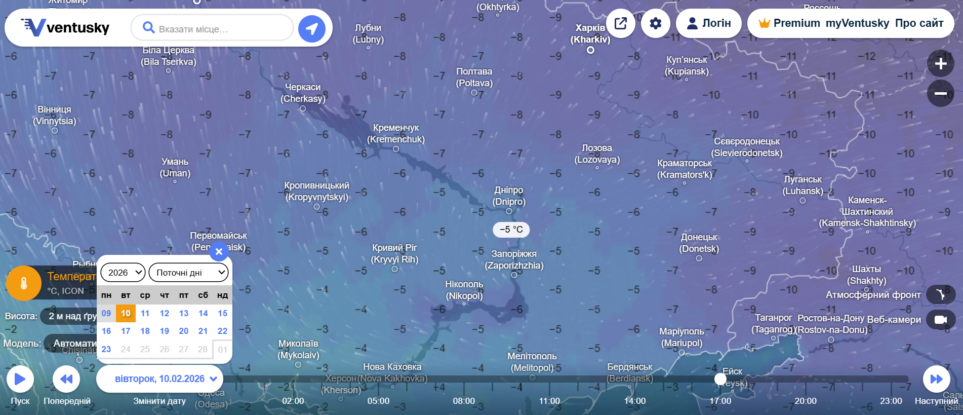За даними ventusky, завтра, 10 лютого, мороз не відступить: вночі повітря опуститься до близько –12 °C, а вдень стовпчики термометрів піднімуться до приблизно — 5 °C, без опадів під впливом антициклону.
