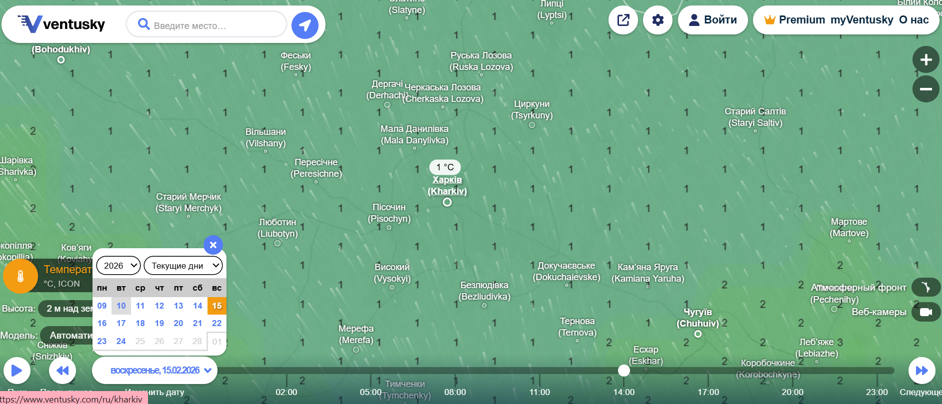 Погода у Харкові на 15 лютого. Фото: ventusky