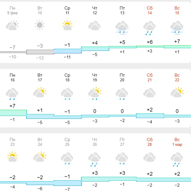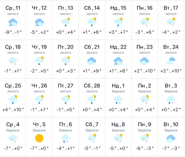 Такої думки дотримуються і фахівці з сайту meteo.uа. Вони також прогнозують потепління приблизно з 13 лютого. Проте, на відміну від своїх колег, вони вважають, що мінусової температури у лютому жителям Дніпра вже й не варто чекати. З 13 лютого температура триматиметься на рівні 0+10 градусів. Часом можливий дощ та сніг.