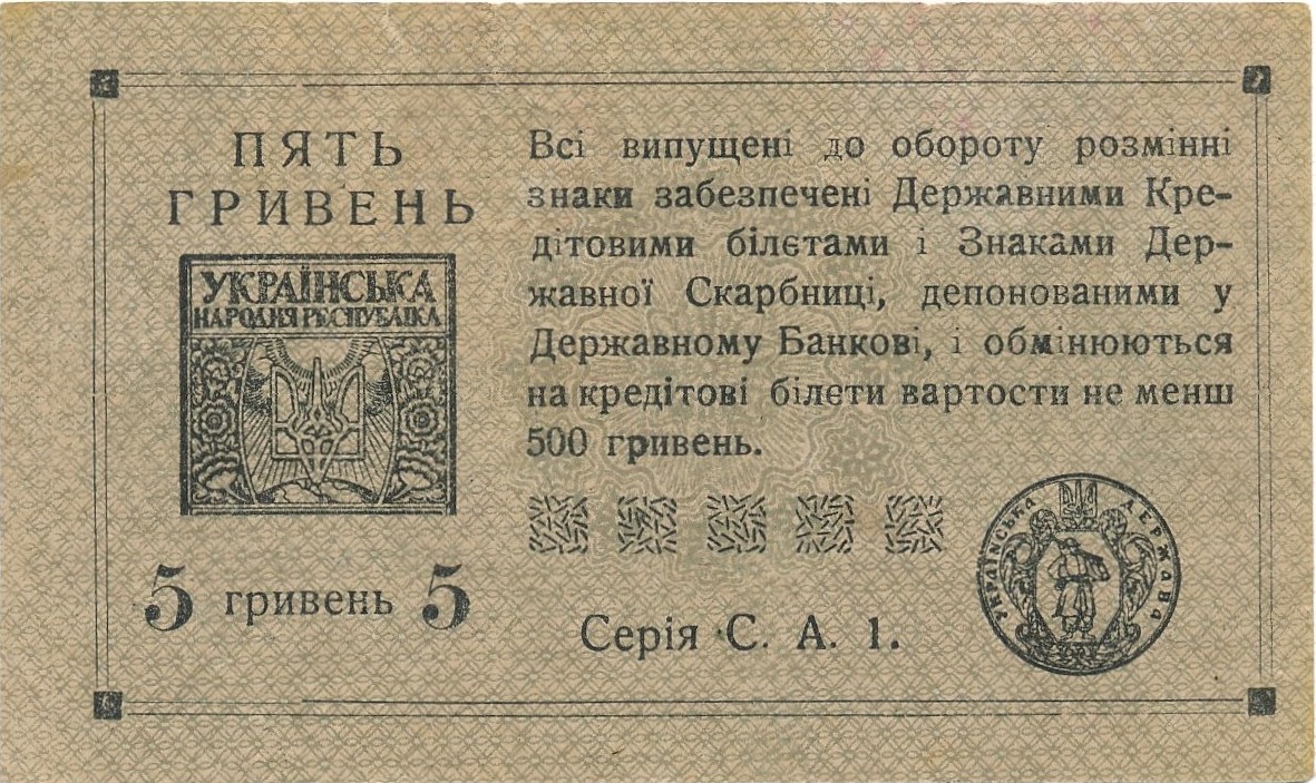 У 1919 році було надруковано 5-гривневі банкноти. Вони друкувалися в Кам’янець-Подільській фортеці та Станіславі, бо наприкінці 1918 — на початку 1919 року значна територія країни, включаючи Київ, була захоплена більшовиками. Банкнота мала максимально спрощений дизайн, на ній зображалися лише тризуб та пояснювальні написи.