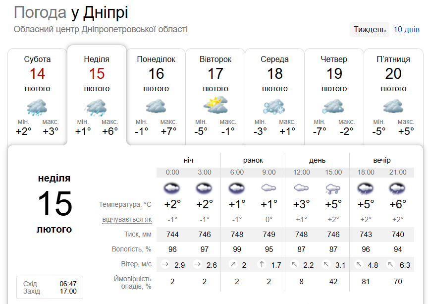 За прогнозом сайта sinoptik.ua, суттєві дощі поливатимуть Дніпропетровщину ще 15 лютого. З початку наступного тижня дощі припиняться, але вже у середу випаде сніг.