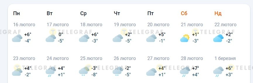 У понеділок, 16 лютого, буде відносно тепло. Вдень повітря прогріється до +6 °C, вночі температура знизиться до -4 °C. Але у вівторок, 17 лютого, стане прохолодніше, адже вдень буде близько 0 °C, а уночі до -5 °C.