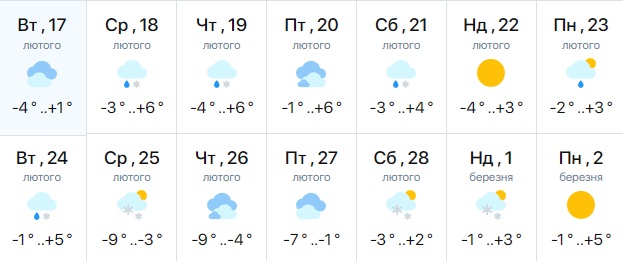 Про це свідчать прогнози погоди. Так, за даними сайту meteo.ua, з 18 лютого до обласного центру прийдуть стабільні "плюси" з невеликими нічними морозами. Наприклад, з 18 до 24 лютого температура повітря може коливатися в районі -4+6 градусів. можливі опади у вигляді дощу зі снігом.
