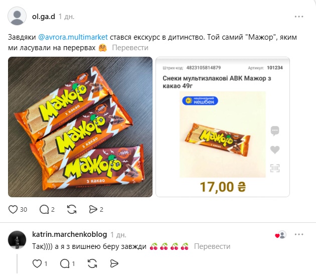 "Завдяки "Аврора" відбувся екскурс у дитинство. Той самий "Мажор", яким ми ласували на перервах", — пише вона.