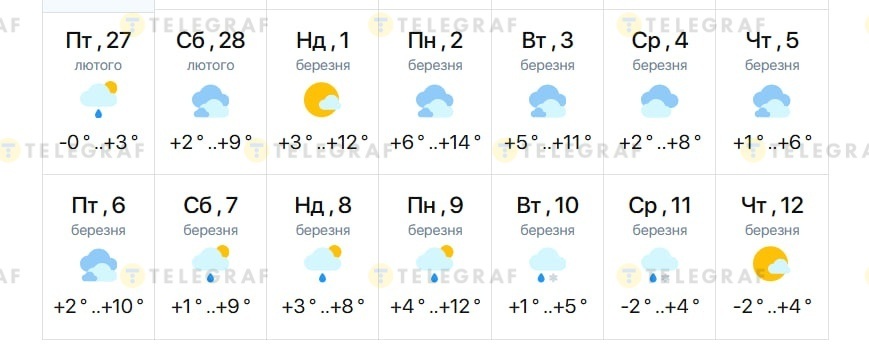 За прогнозом "Meteo", потепління увірветься у місто вже у першій декаді березня. Період 1-3 березня очікується найтеплішим, адже тоді повітря прогріється до +14 градусів вдень та +6 градусів вночі. Після того температура трохи опуститься, але ненадовго. У п'ятницю та понеділок, 6-7 лютого, стовпчики термометрів також сягнуть +10…12 градусів у денний час. Надалі очікується відчутне похолодання з невеликими нічними морозами.