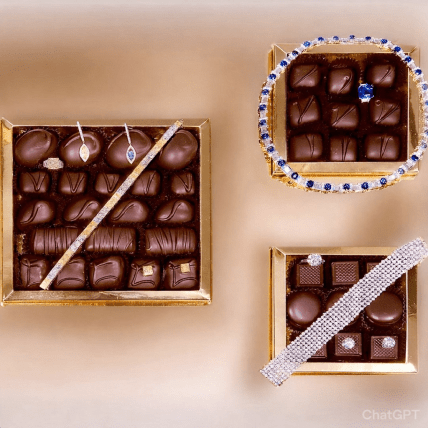 Усередині елегантної коробки — ручної роботи шоколадні трюфелі, відібрані майстром-кондитером із бездоганним смаком. Та поруч із ними — ювелірні прикраси: кольє, персні, браслети, сережки, інкрустовані діамантами, сапфірами, смарагдами та рубінами. Саме ці коштовності й формують ту саму астрономічну ціну.