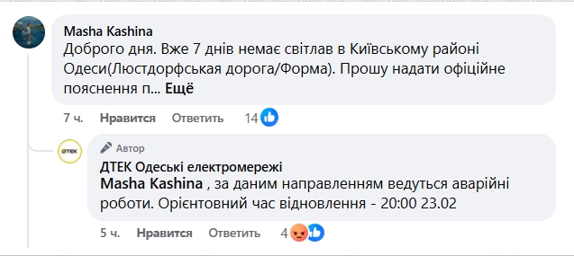 До компанії ДТЕК Одеські електромережі звернулась одеситка, яка повідомила, що в неї вже 7 днів немає світла. Її будинок знаходиться в Київському районі Одеси.