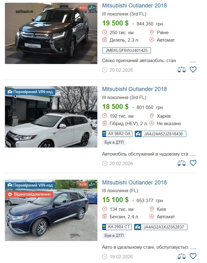 - Mitsubishi Outlander 2018 року випуску, яку він придбав у 2019 році за 932 200 гривень. Варто зазначити, що зараз такий автомобіль можна придбати на вторинному ринку за ціною близько 15-20 тисяч доларів (~600-900 тисяч гривень).