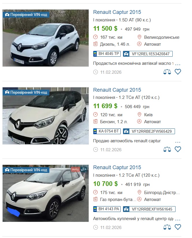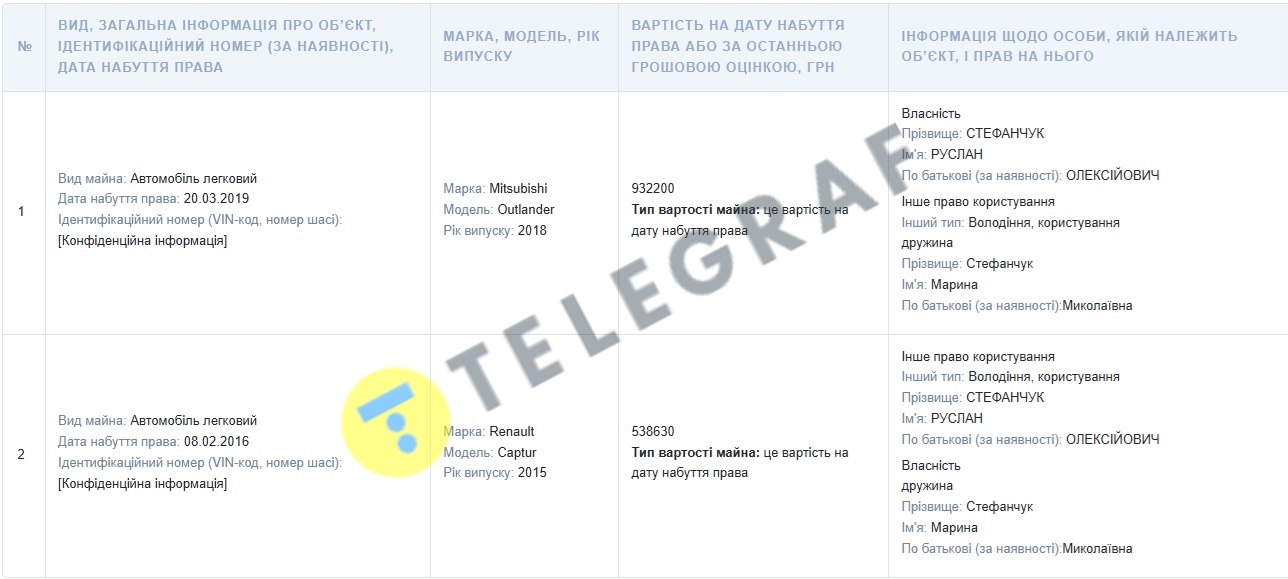- Renault Captur 2015, придбаний у 2016 році за 538 630 гривень (записаний на дружину). Нині такий на вторинному ринку можна придбати приблизно за 10 тисяч доларів (430 тисяч гривень).