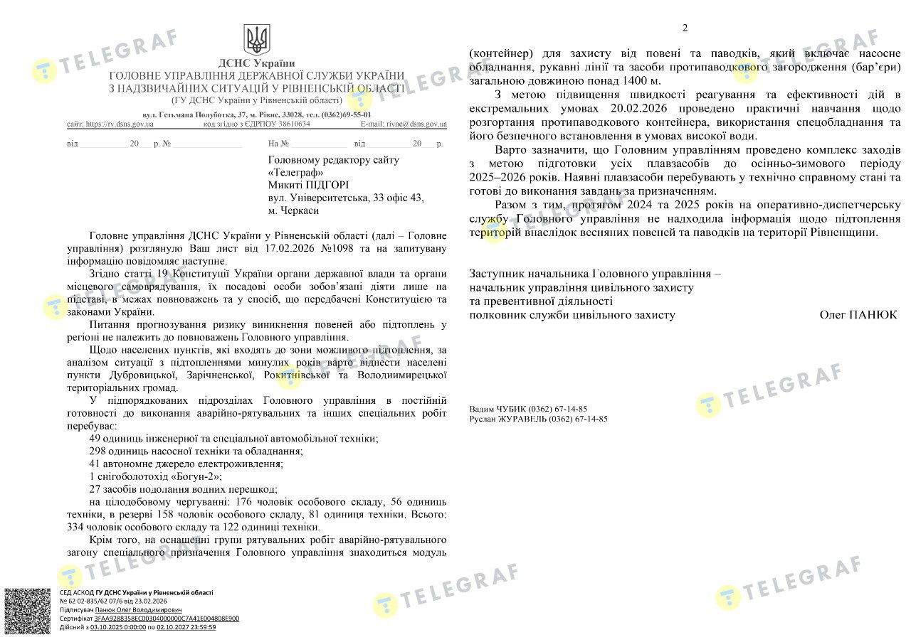 Плавзасоби підготували до осінньо-зимового періоду 2025–2026 років. Усі вони справні і готові до роботи. При цьому протягом 2024 та 2025 років до служби не надходило жодної інформації про підтоплення територій через весняні повені чи паводки на Рівненщині. Втім, цього року синоптики повідомляють, що підтоплень очікувати все ж варто.