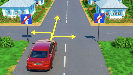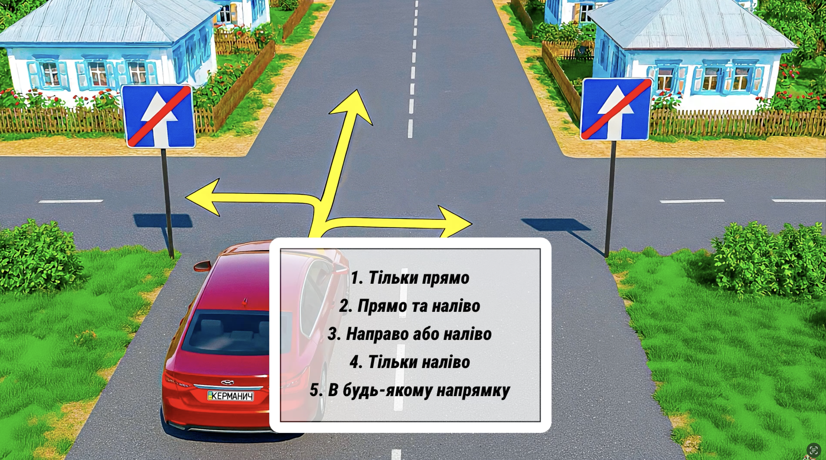 Водій червоного автомобіля наближається до перехрестя. Перед ним встановлено знак, а на дорозі змодельовано три можливі напрямки руху: прямо, ліворуч та праворуч. Куди дозволено продовжити рух водієві червоного автомобіля?