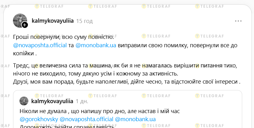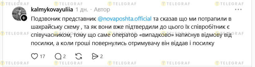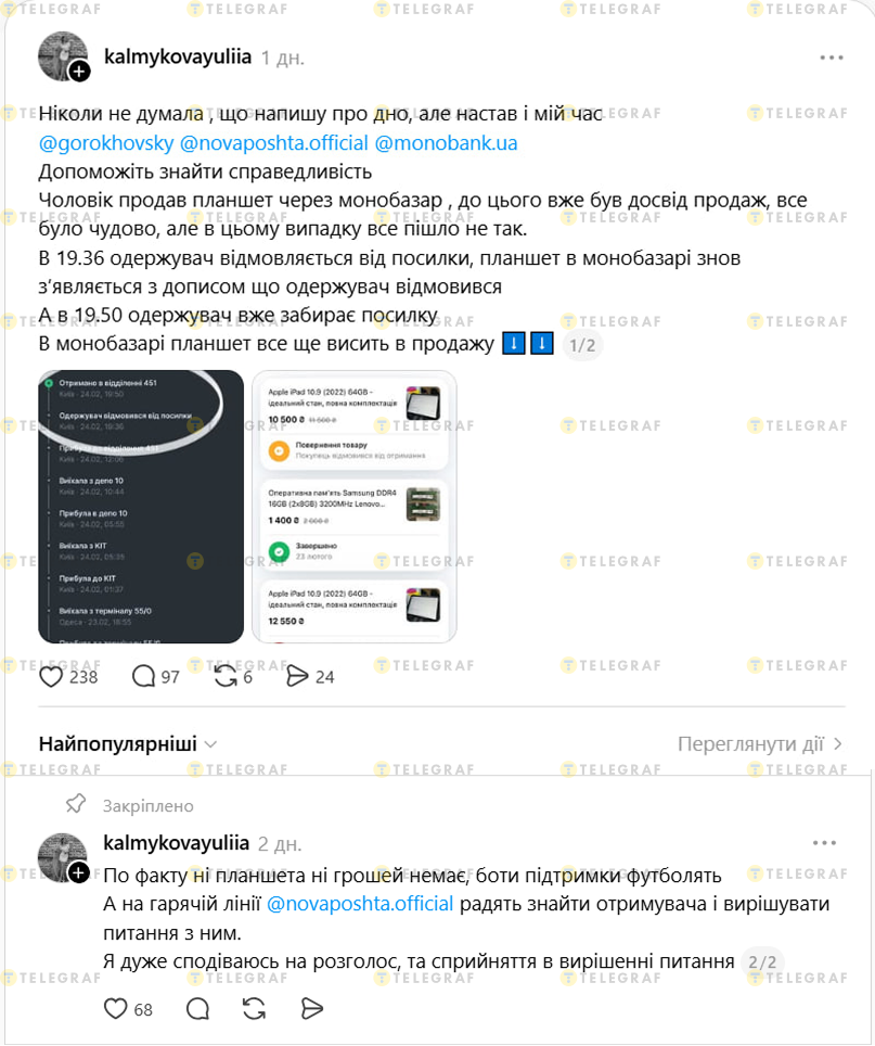 Жінка публічно звернулась до Монобанку, Нової пошти та співзасновника Монобанку Олега Гороховського. Як з'ясувалось — це шахрайська схема. Як пише Юлія, про неї розповіли в Новій пошті. "Як вони вже підтвердили, до цього їх співробітник є співучасником, тому що саме оператор "випадково" натиснув відмову від посилки, а коли гроші повернулись отримувачу він віддав і посилку", — зазначає авторка.
