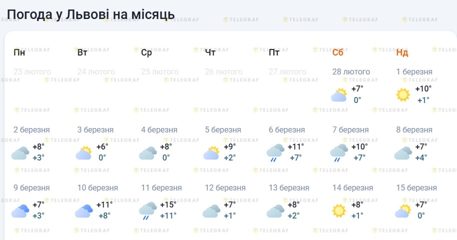 Якою буде погода у Львові до 15 березня 2026